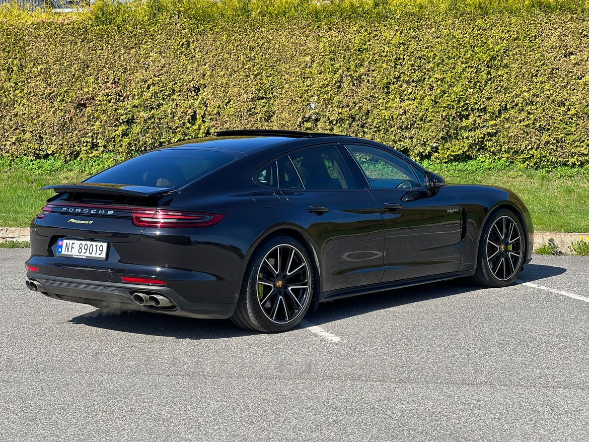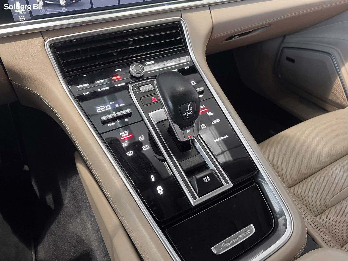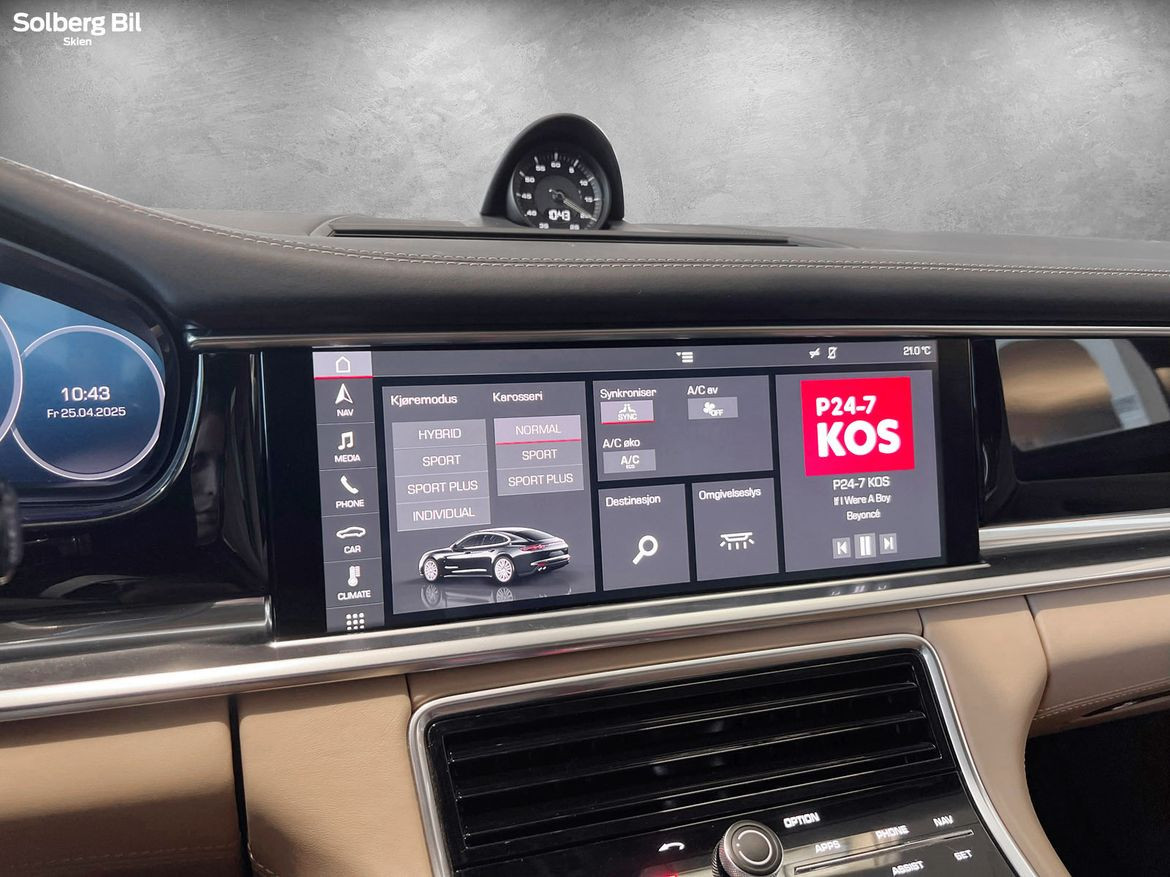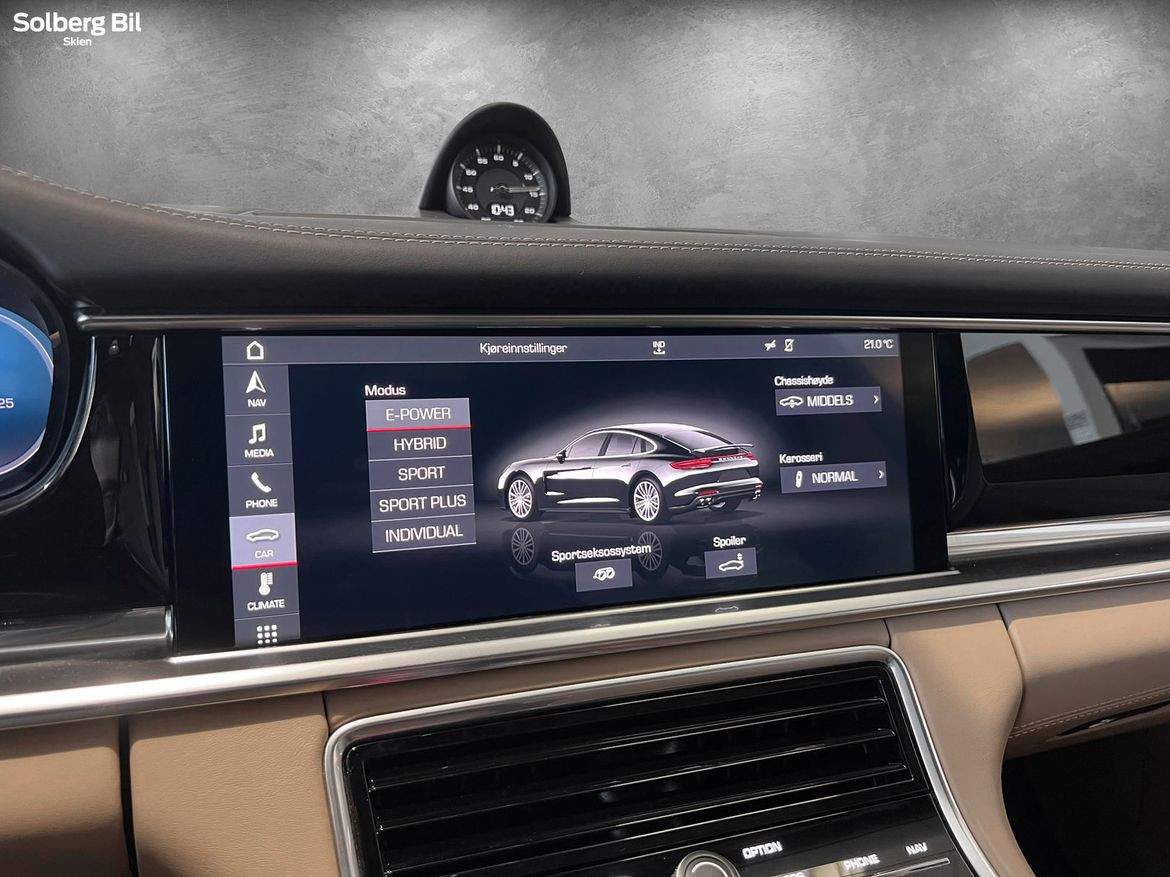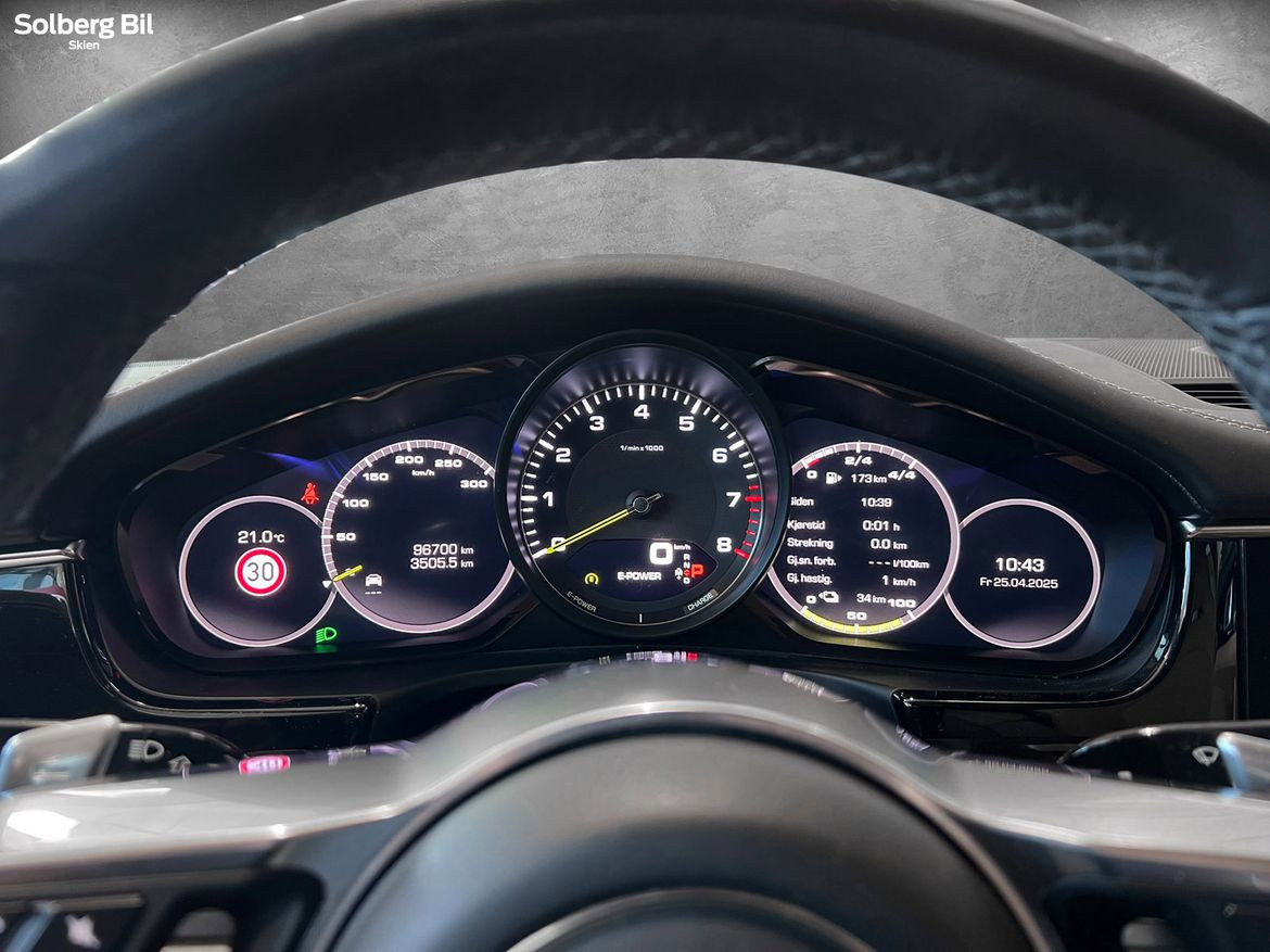 Denne Panamera 4 E-Hybrid leverer det beste fra to verdener med sin kombinasjon av en 2.9L V6 turbomotor og en elektrisk motor. Med en total systemeffekt på 462 hk og et dreiemoment på 700 Nm, akselererer bilen fra 0 til 100 km/t på kun 4,6 sekunder. Hybrid-drivlinjen gir deg også en elektrisk rekkevidde på opptil 50 km – perfekt for utslippsfri bykjøring. PDK-girkassen sikrer raske girskift, og med firehjulstrekk får du eksepsjonelt veigrep under alle forhold.